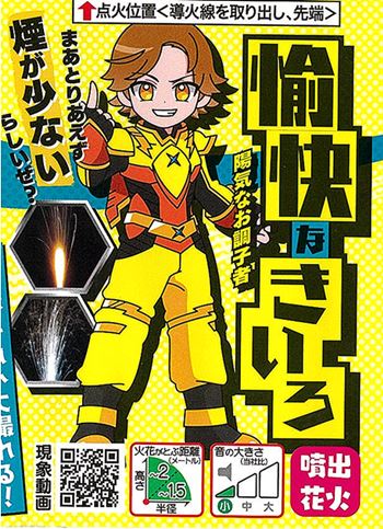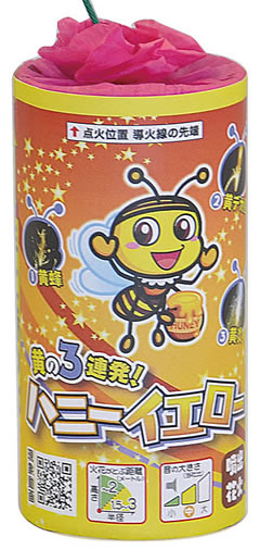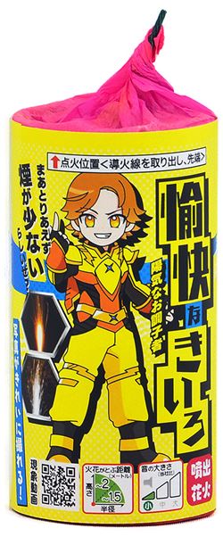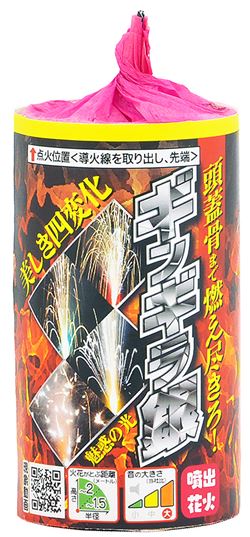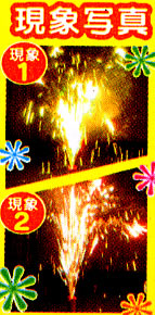 燃焼時間約25秒煙少なめ 錦火を噴き、次に赤い炎を噴き、続いて辺りを黄色くする程の真っ黄な炎を噴き、最後に黄金色の火花を噴出します。