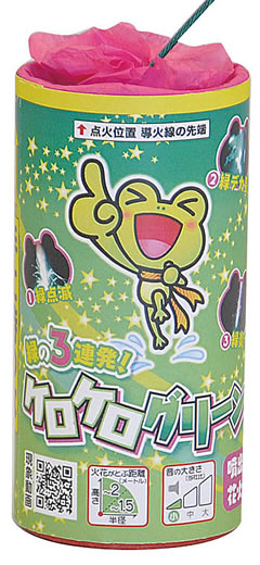 子供さんに人気☆ この1本に3色の緑!メロングリーンからカエルグリーン、そしてイエローグリーンと3種の緑色の噴水花火です。