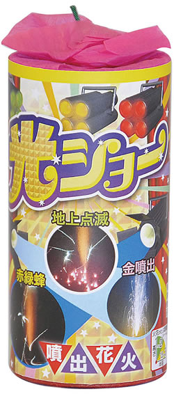 燃焼時間約25秒赤、緑、黄、紫色火花を順次噴き出し、最後にバリバリと音を発て、白点滅星を噴出します。