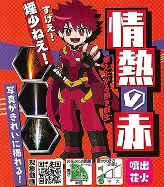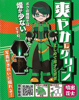 「バランスレンジャー」は「情熱の赤」「愉快なきいろ」「爽やかにグリーン」の3人戦隊です! まじめで秀才な賢者変身(変色)が得意なヒーロー戦隊「バランスレンジャー」の後方支援役です。 朝食などに、赤・黄・緑の3つの食品群をバランスよく召し上がると体に良いのですが、是非、3人のヒーローを召還し、元気をもらいましょう♪ 煙も少なく環境にも優しいヒーローの登場!音も小さめだよ。 緑色の炎とチタン系の炎が交互に入れ替わる噴出花火。