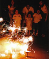 シンプルに銀の噴出花火にこだわりました。 はじめパチパチと花が咲き、その後、銀色の火の粉が高さ約3mくらい噴きあがります。