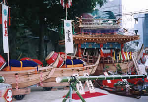 賑町のだしものは、3艘の船で構成されております。男舟「宝恵舟」、女舟「宝来舟」は主に中学生が曳き、その上で小学生が采を振り、太鼓をたたきます。そして大人が「恵比須船」を曳きます。また、幼児は網を打ち、年齢を問わないストーリー性の高いだしものです。 |