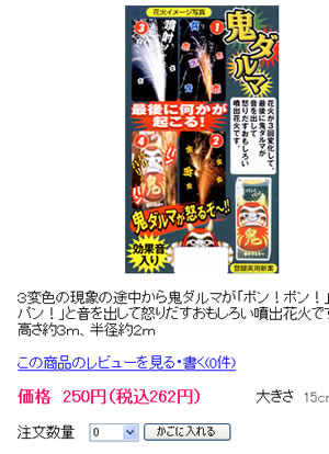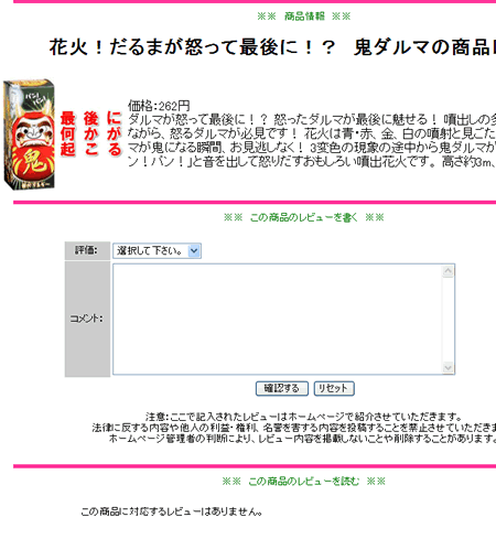 慣れた方・たくさんの投稿をしてくださる方へ レビューのアドレスは、次のとおりです。 https://www.hanabistore.com/rv/?p=●●●● ●には、商品番号(数字)が入ります。 例えば、上記で紹介した「鬼ダルマ」 商品番号が、5093 ですので、レビューアドレスは、 https://www.hanabistore.com/rv/?p=5093 ぜひ、たくさんのレビュー投稿お願い申し上げます! |